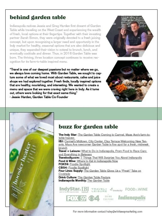 The Garden Table is a local eatery and fresh juicery with three Indianapolis locations. This Press Kit Release was created under the request of Whirlaway Marketing.